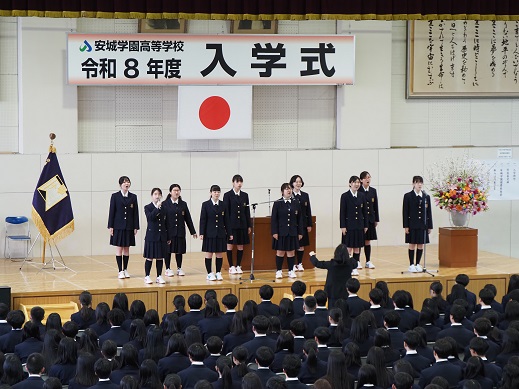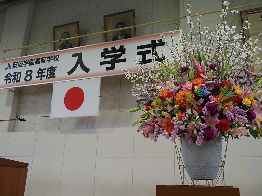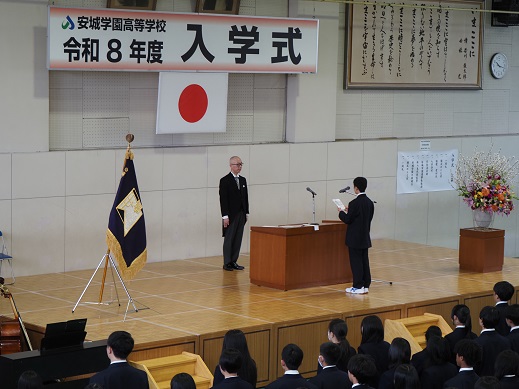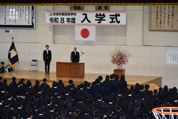 続いて、学校長より新入生への激励の言葉が述べられ、本校の建学の精神に触れながら、その理念のもとで充実した高校生活を送り、主体的に学び成長してほしいとの期待が伝えられました。理事長挨拶では、「知・徳・体・感・行」の学習モデルに触れ、知識や学力だけでなく、人としての徳や豊かな感性、健やかな身体、そして実践する力をバランスよく身につけることの大切さが語られました。新入生代表宣誓では、高校生活への決意と目標が力強く述べられ、会場は引き締まった雰囲気に包まれました。また、安城学園の歌の紹介も行われ、今後の学校生活への意識を高める機会となりました。
