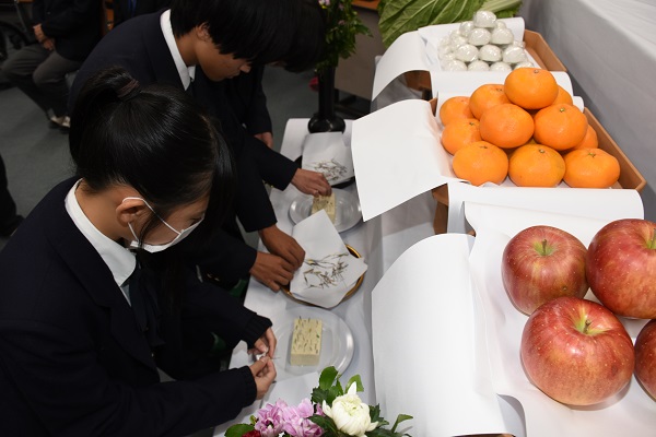 日頃お世話になっている針に感謝の気持ちを込め、折れた針や古い針を豆腐に刺して供養しました。家庭科の授業で使用する道具を大切にする心をあらためて学ぶ機会となりました。