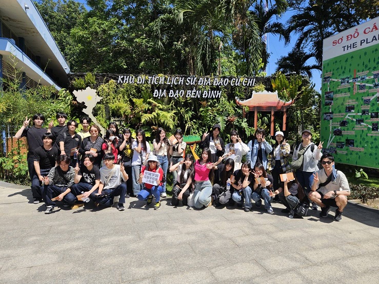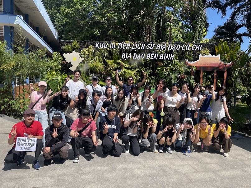修学旅行ベトナムコースでは、クチ地下トンネル、戦争証跡博物館、ベンタイン市場を訪れました。ベトナム戦争の歴史に触れ、当時の人々の暮らしや戦争の実情について学びました。また、ベトナム戦争での被害を乗り越えて平和の大切さを伝えるグエン・ドクさんと記念写真を撮りました。