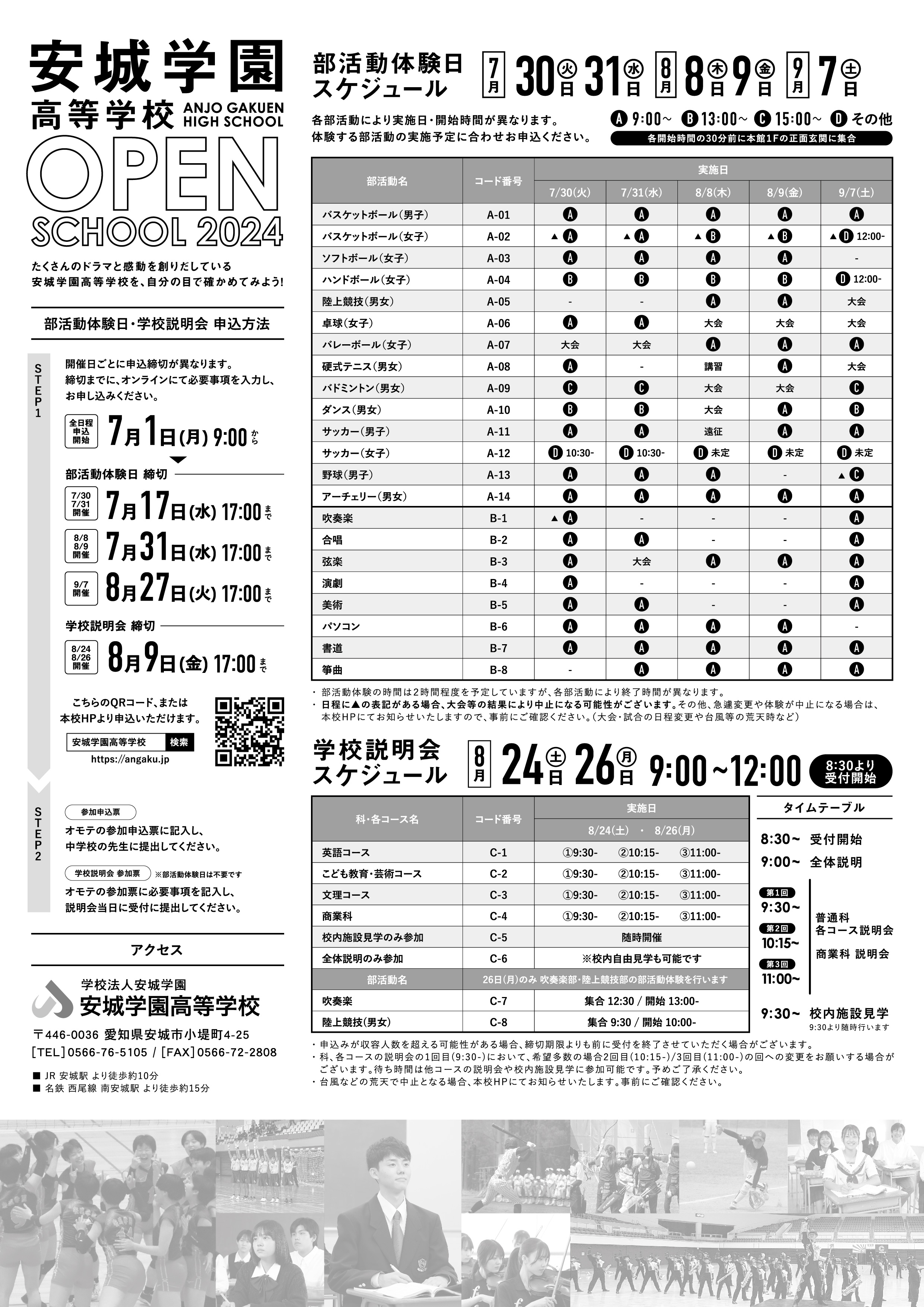 チラシや部活動ごとの開催日・時間など、詳細については [学校見学会のページ]をご覧下さい。