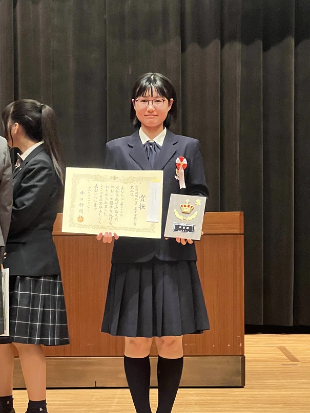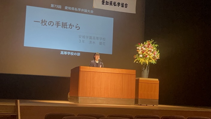 11月20日(木)、瀬戸市文化センターで開催された「第73回私学弁論大会」において、本校3年10組の清水優花さんが出場し、見事 第2位 を受賞しました。併せて、愛知県私学協会長賞・愛知県議会議長賞・中日新聞社賞 を受賞するという大変素晴らしい成果を収めました。