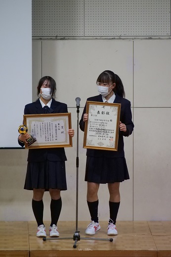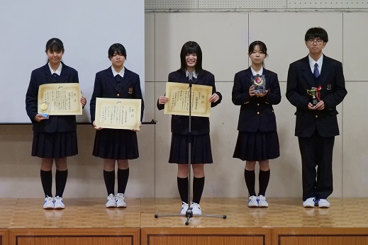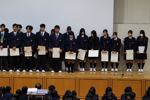 終業式の後には、二学期に活躍した部活動や個人をたたえる伝達表彰がおこなわれ、生徒たちの努力と成果を全校で称えました。