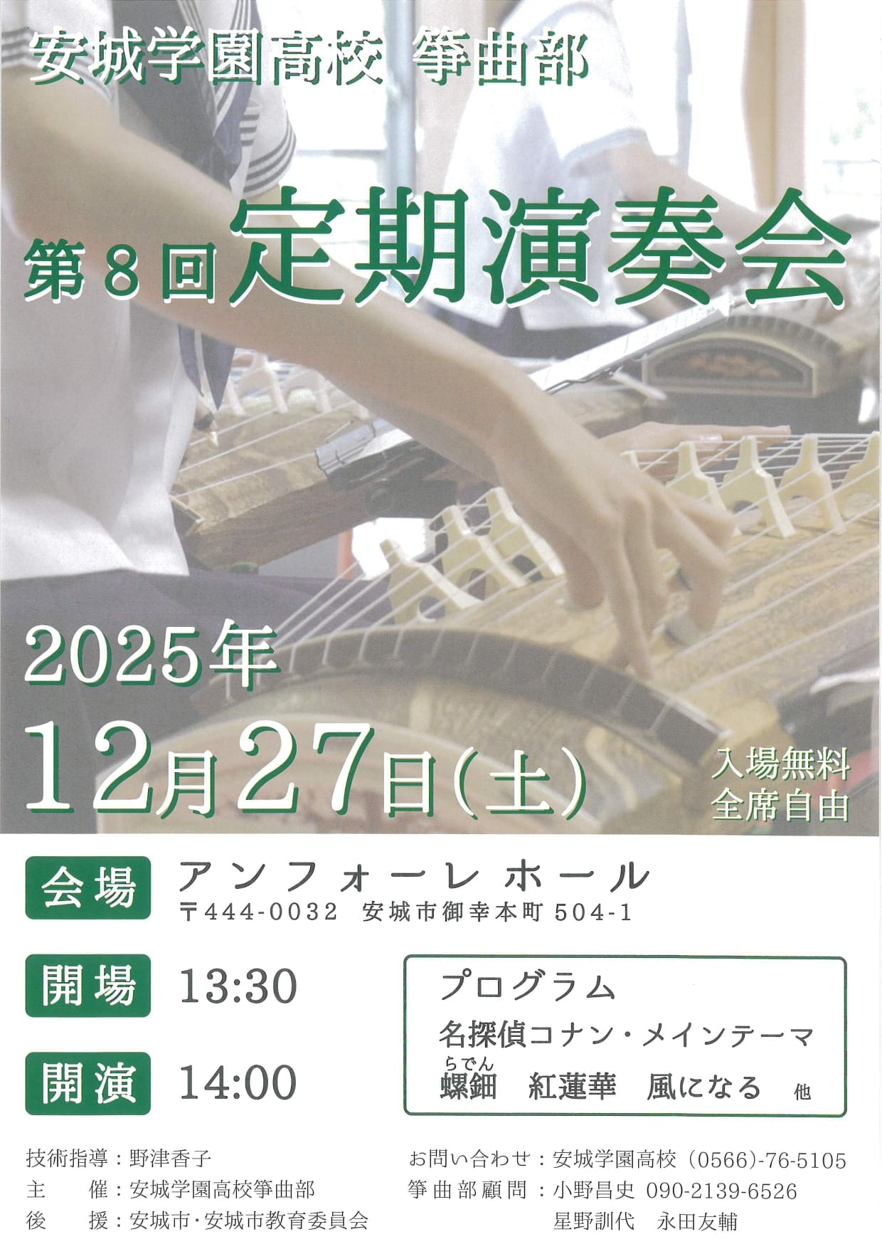 箏曲部 第8回定期演奏会 日時:12月27日(土) 開場 13:30 / 開演 14:00 会場:アンフォーレ ホール 入場:自由(入場無料)
