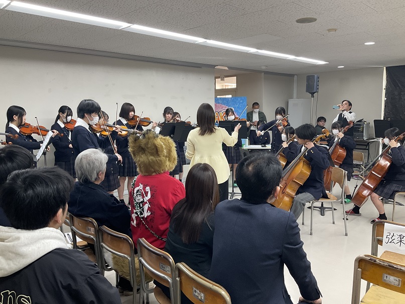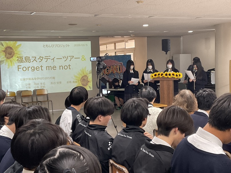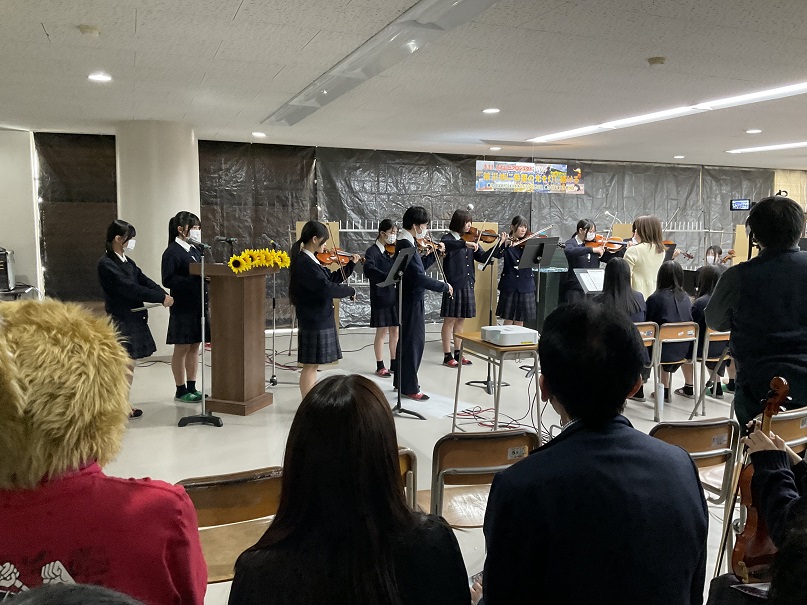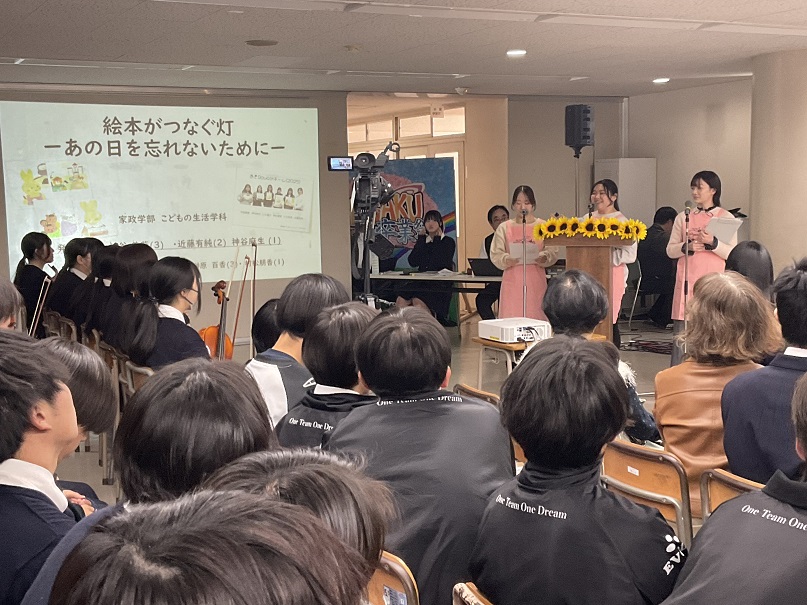 当日は、ひまわり娘による福島スタディツアー報告をはじめ、弦楽部が「ひまわり」「情熱大陸」を演奏し、会場に温かな響きを届けました。また、本校卒業生による防災絵本の紹介もあり、防災・減災について改めて考える機会となりました。
