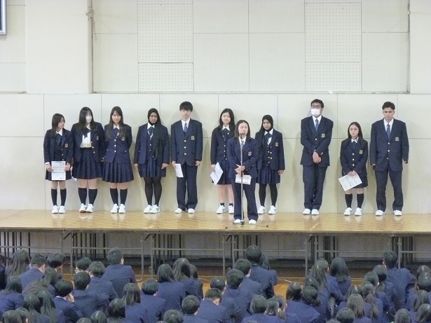 また、壮行会では、全国大会に出場する卓球部、アーチェリー部、ダンス部、探究発表の代表生徒たちが紹介され、全校で激励の拍手を送りました。