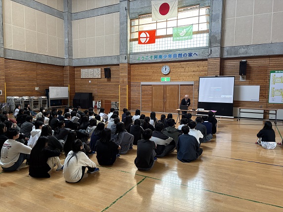 4月14日(火)から15日(水)にかけて、第1パート1年生(2クラス)が阿南少年自然の家にてフレッシュマン・キャンプを実施しました。予想されていた天気は晴れとなり、気候も思った以上に暖かく感じられました。一方で、桜はすでに散っており、季節の移ろいが感じられました。1日目は昼食後、入所式およびガイダンスを行い、その後クラス・レクリエーションに取り組みました。続いて、3年生アシスタントの先輩から話を聞き、学校生活への理解を深めました。