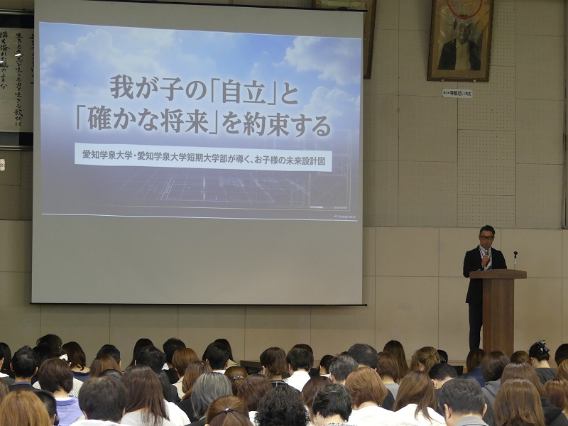 進学分野では、ベネッセコーポレーションより大学入試の最新動向や学習の進め方について、愛知学泉大学入試課より大学の特色や入試制度について、本校進路指導主事より本校の進路指導の方針や今後の流れについて説明がありました。