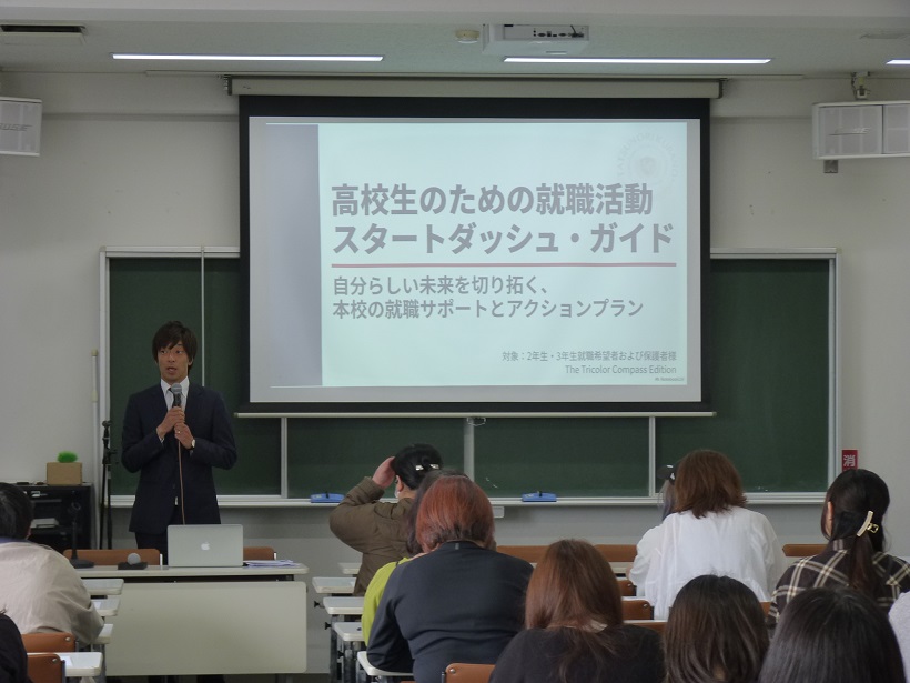 就職分野では、本校就職指導主任より就職活動の流れや企業選択のポイントについて具体的な説明を行い、保護者の皆様には熱心に耳を傾けていただきました。